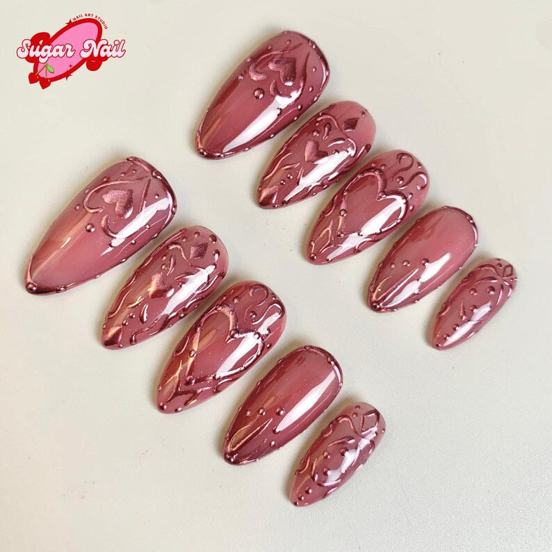 Em's Heart Press On Nails – Sweet heart-themed designs with soft romantic tones. Long-lasting, cute, and perfect for date nights, feminine looks, and everyday charm.