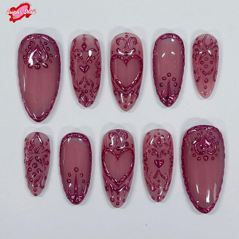 Make a bold statement with Crimson Luxe! This deep red press-on nail set features an elegant 3D embossed design, intricate detailing, and a high-gloss finish for a luxurious and striking manicure.