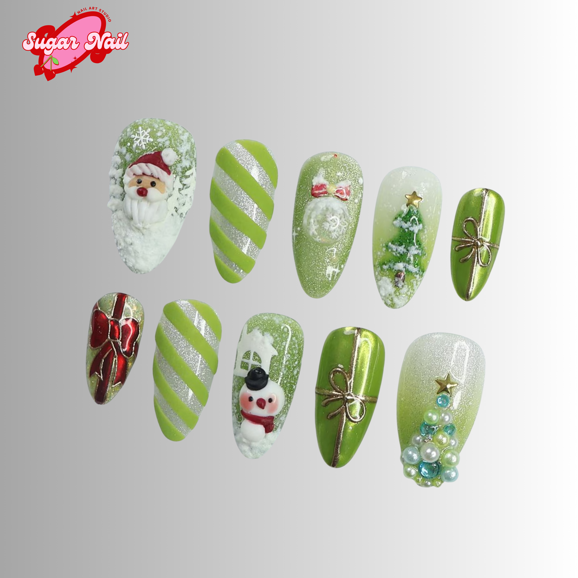 Festive Green Press On Nails โ elegant green holiday designs with a sparkling finish. Easy to apply, long-lasting, and perfect for classy Christmas and winter looks.