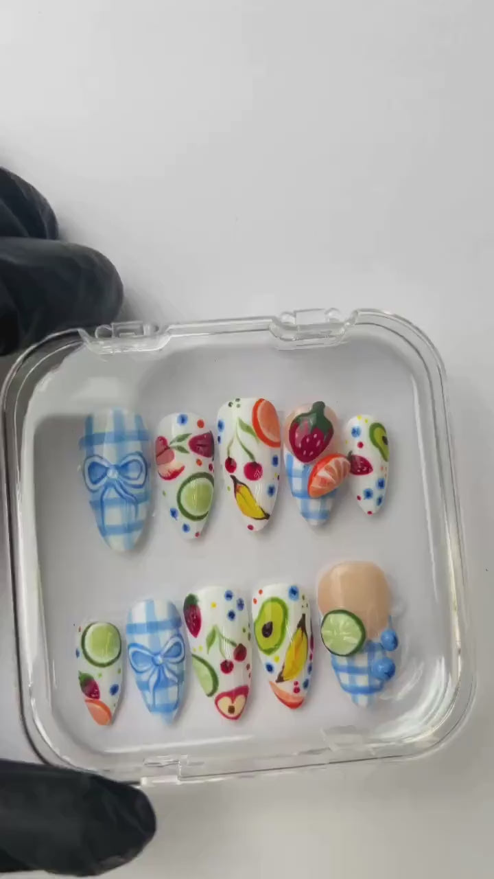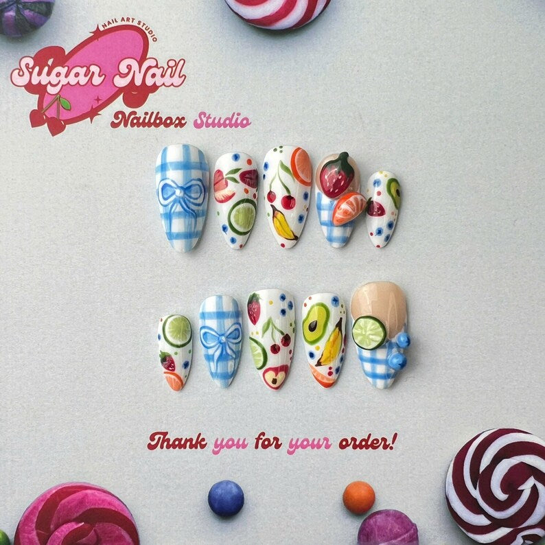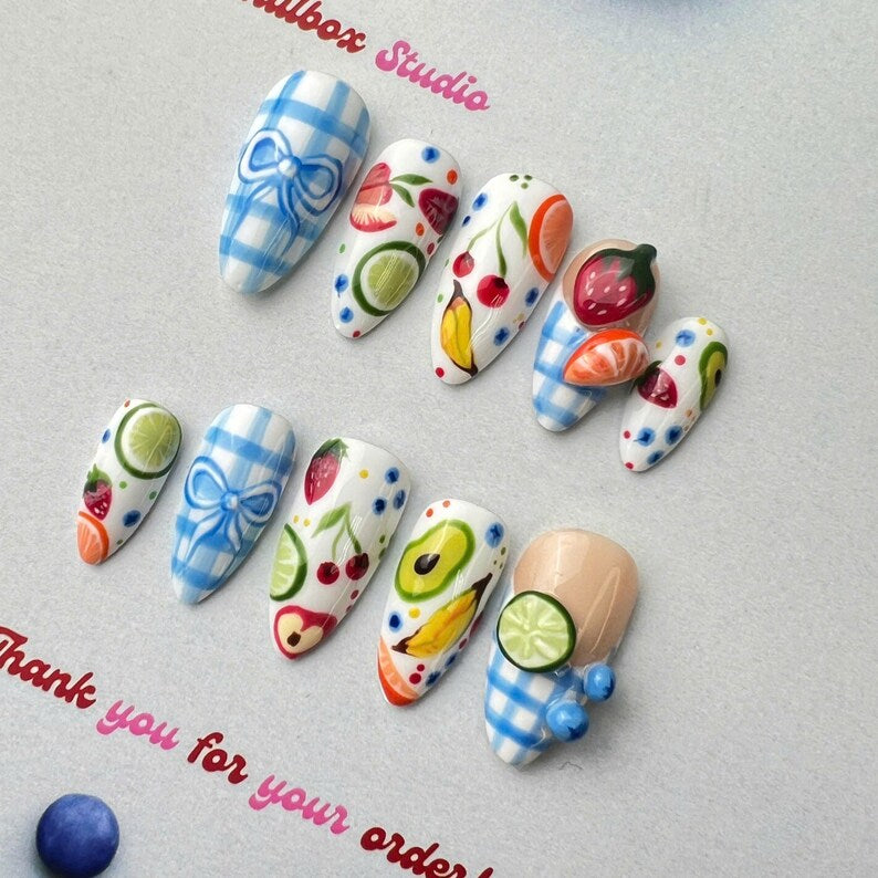 Fruit Picnic Fresh Fruit Press On Nails โ Cute fruity designs with charming gingham details. Fresh, vibrant, long-lasting nails perfect for summer picnics, parties, and daily fun.