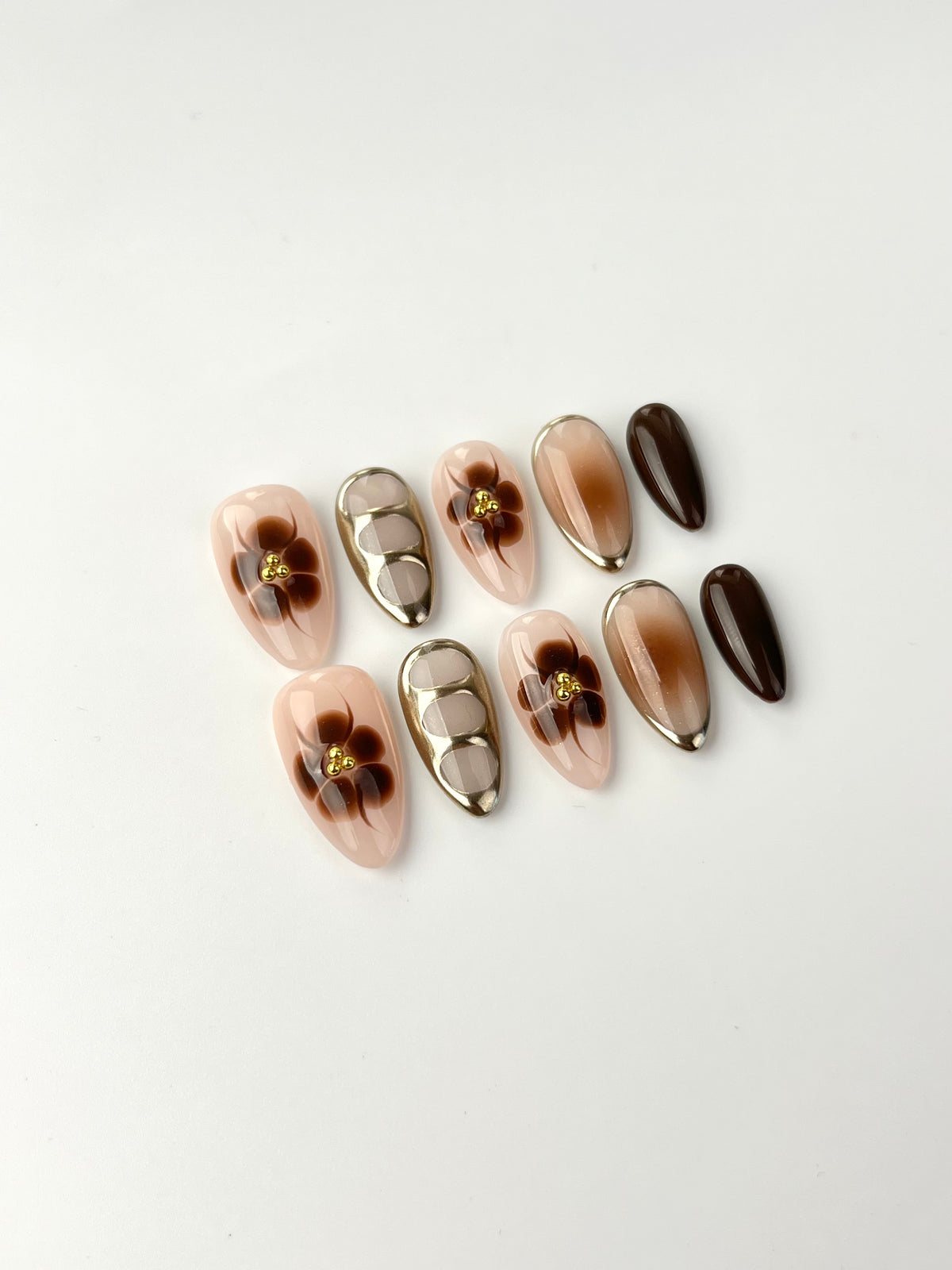 This set is perfect for anyone who loves a clean, minimalist, and classy style. The soft beige tones add subtle sweetness, while the deeper brown nails provide a rich, bold contrast — like your favorite cup of gourmet coffee.