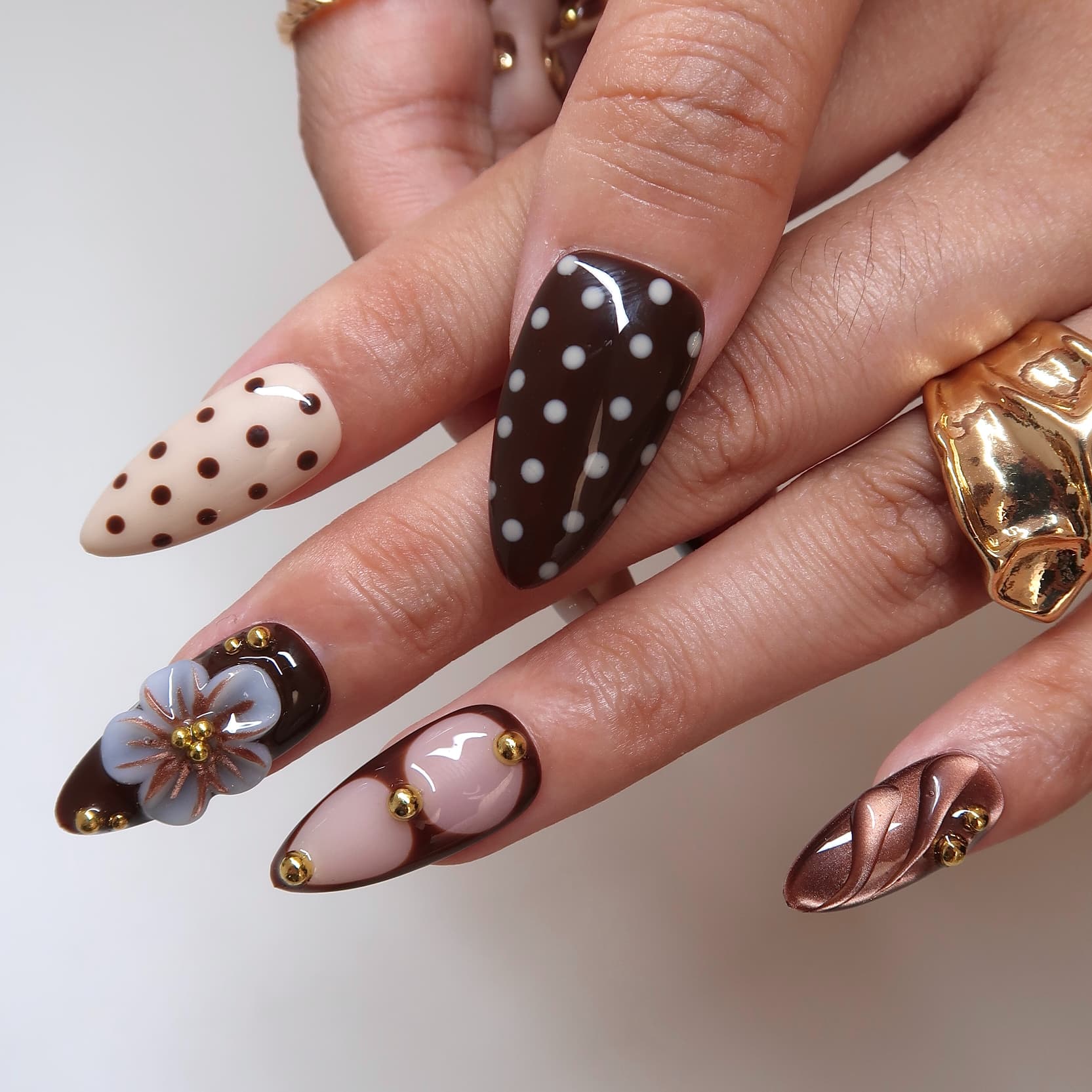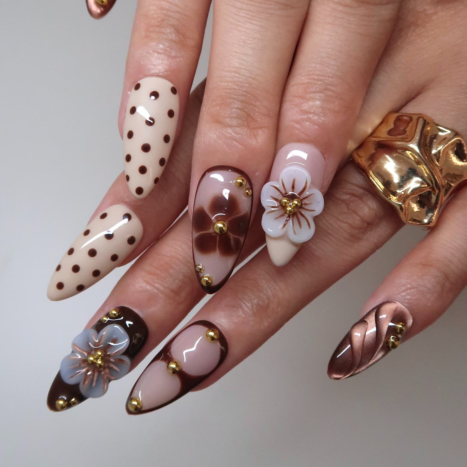 Step into wild elegance with Golden Safari. This stunning set features warm brown tones enhanced by playful polka dots, creating a refined yet adventurous look. The French and gradient designs blend seamlessly for a soft, natural charm, while 3D floral accents and gold bead embellishments add a touch of luxury. Perfect for anyone who loves sophistication with a hint of the untamed.