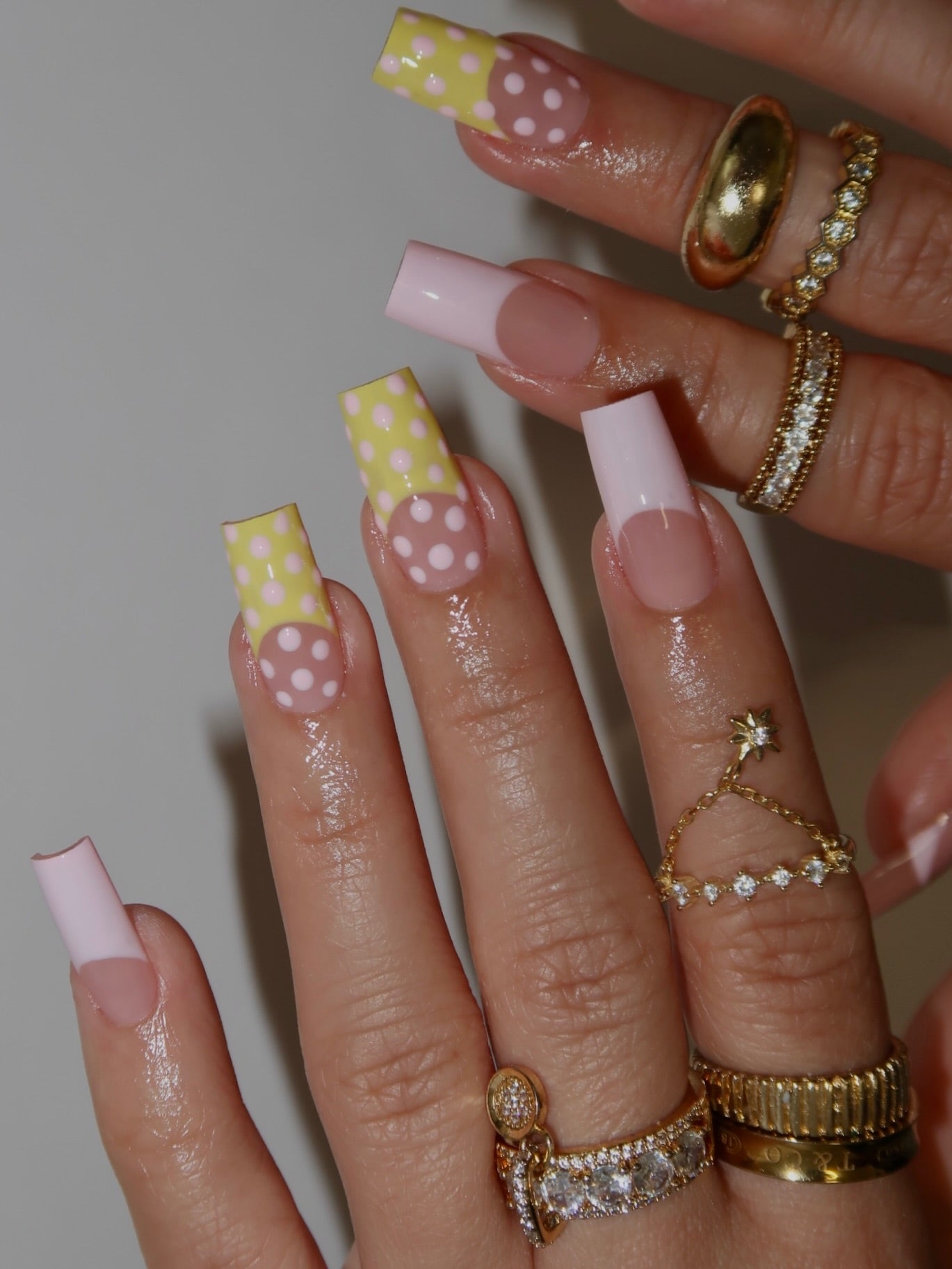 Handmade Pastel Yellow & Pink Polka Dot Press On Nails - Long Square Retro French Tip Nails - Cute Spring Summer Pop Art Fake Nails