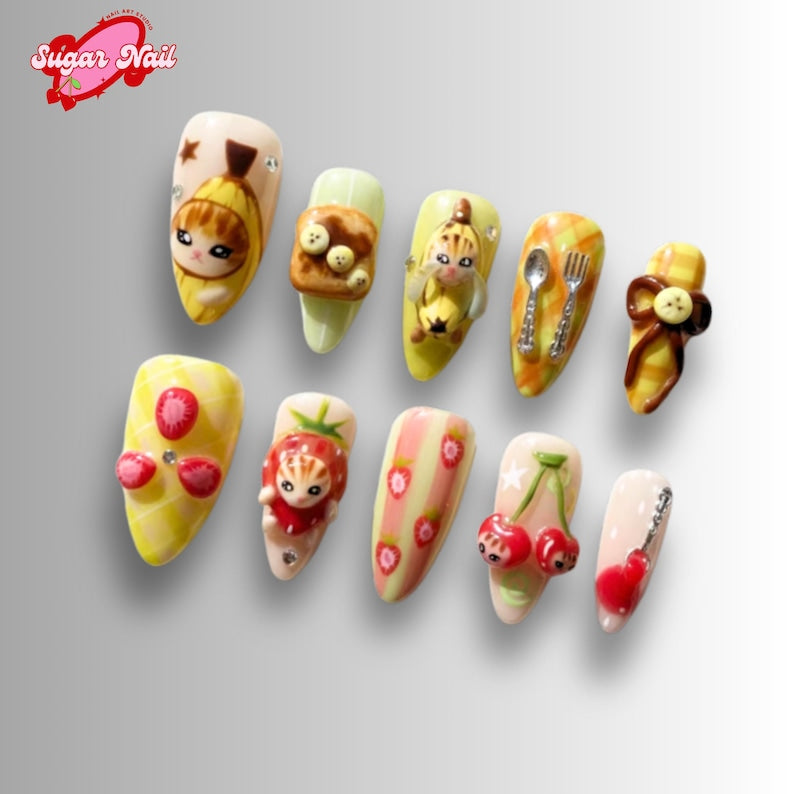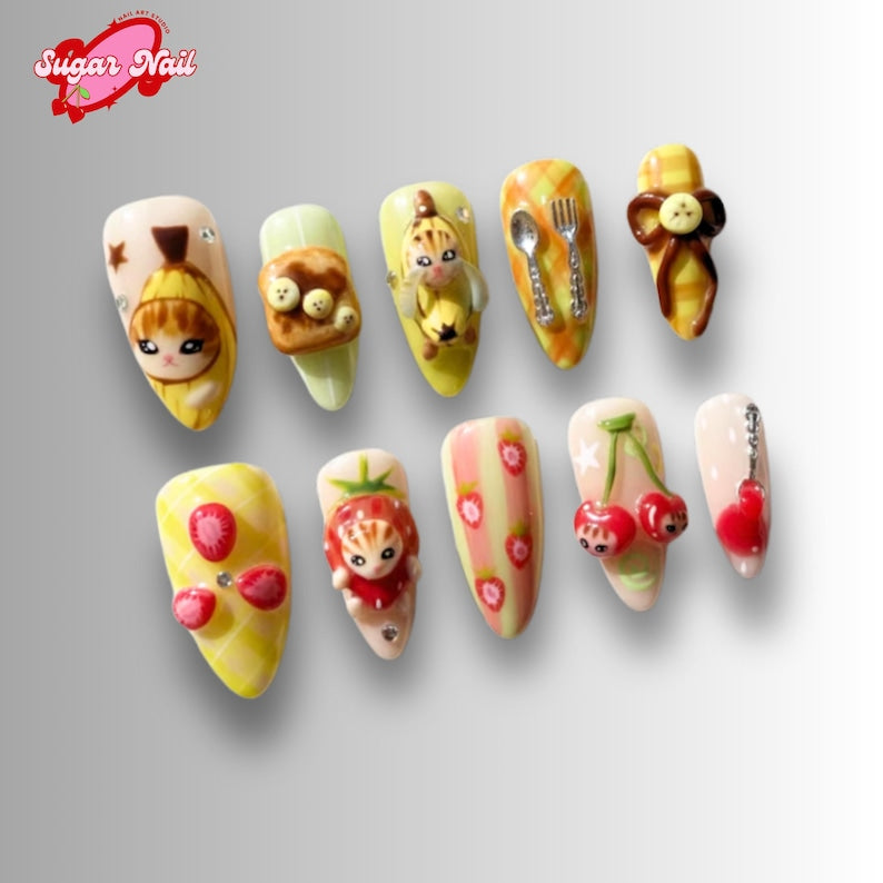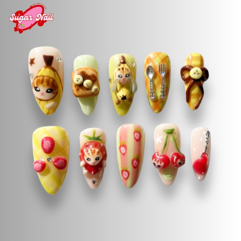 Add a whimsical twist to your nails with Herringbone Aurora — a handcrafted press-on nail set inspired by adorable cats, juicy strawberries, and vibrant aurora-inspired colors. Featuring rich reds, sunny yellows, and charming cat and strawberry accents, this set creates a playful, eye-catching look perfect for everyday wear, casual outings, or fun photoshoots.