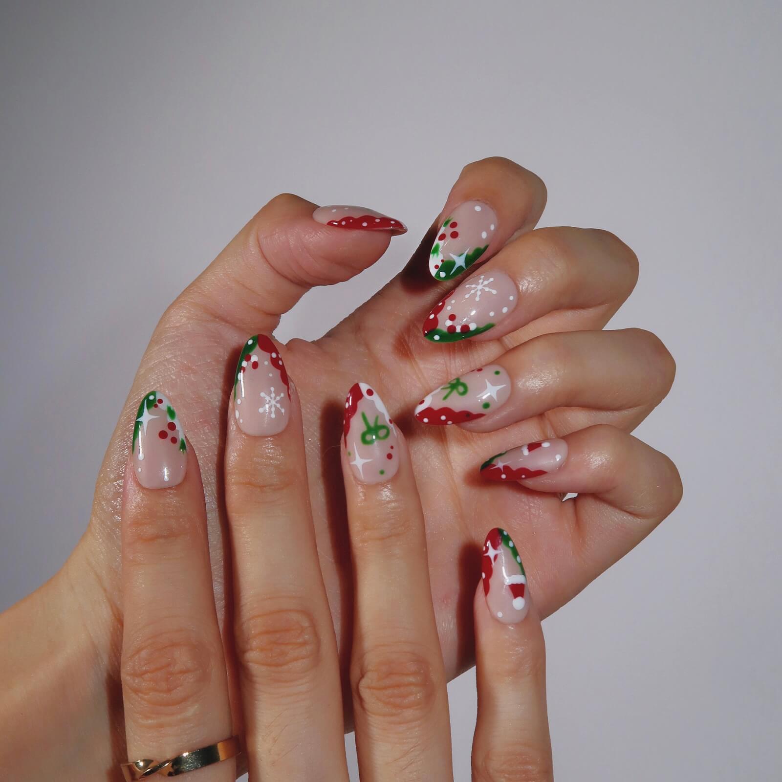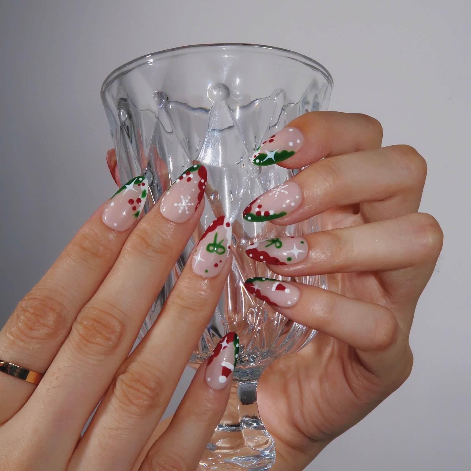 Celebrate the festive season with Holly Jolly, a design bursting with holiday cheer. Featuring a nude base, this joyful set is adorned with red, green, and white accents that capture the essence of Christmas. Delicate snowflakes, charming Christmas trees, and playful Santa hats complete the design, making it perfect for spreading holiday spirit. Add a touch of festive magic to your nails with Holly Jolly!
