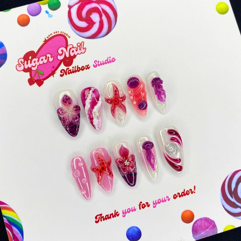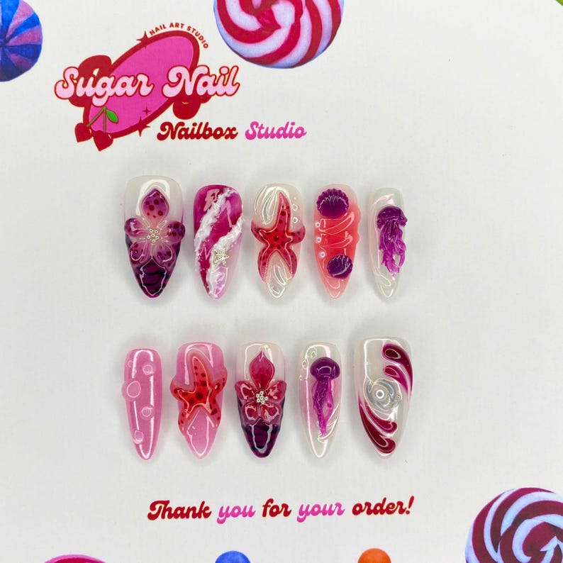 Jellyfish โ Ethereal ocean-inspired press on nails with soft translucent hues and floating jellyfish vibes. Elegant, long-lasting design perfect for summer and beach lovers.