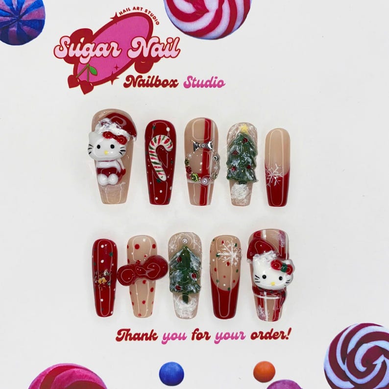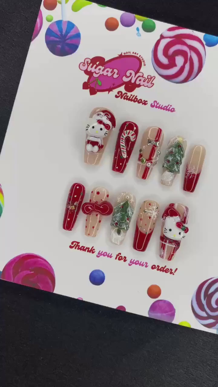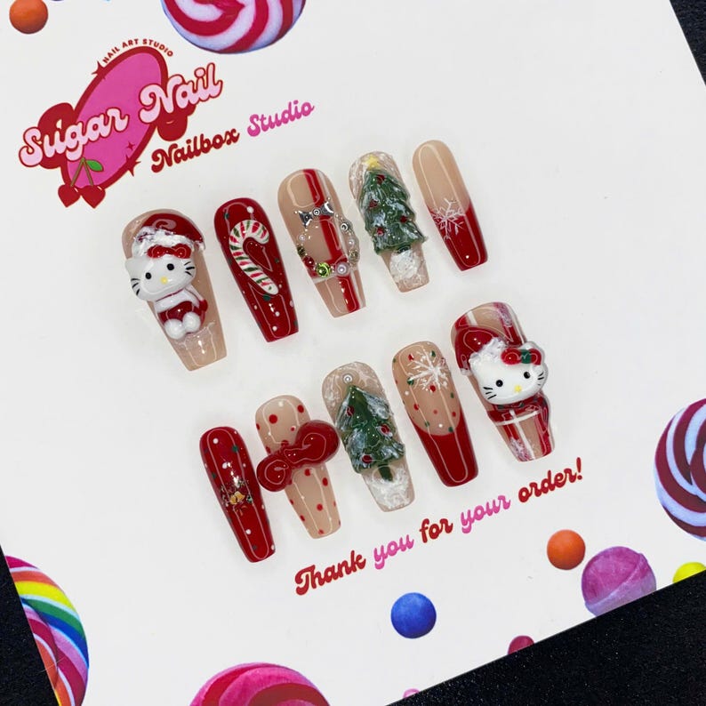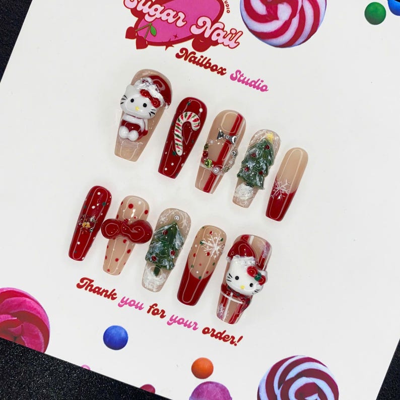 ๐๐ฑ Kitty Xmas Press On Nails โ cute Christmas cat designs with festive sparkle. Easy to apply, long-lasting, and perfect for adorable holiday-season looks.