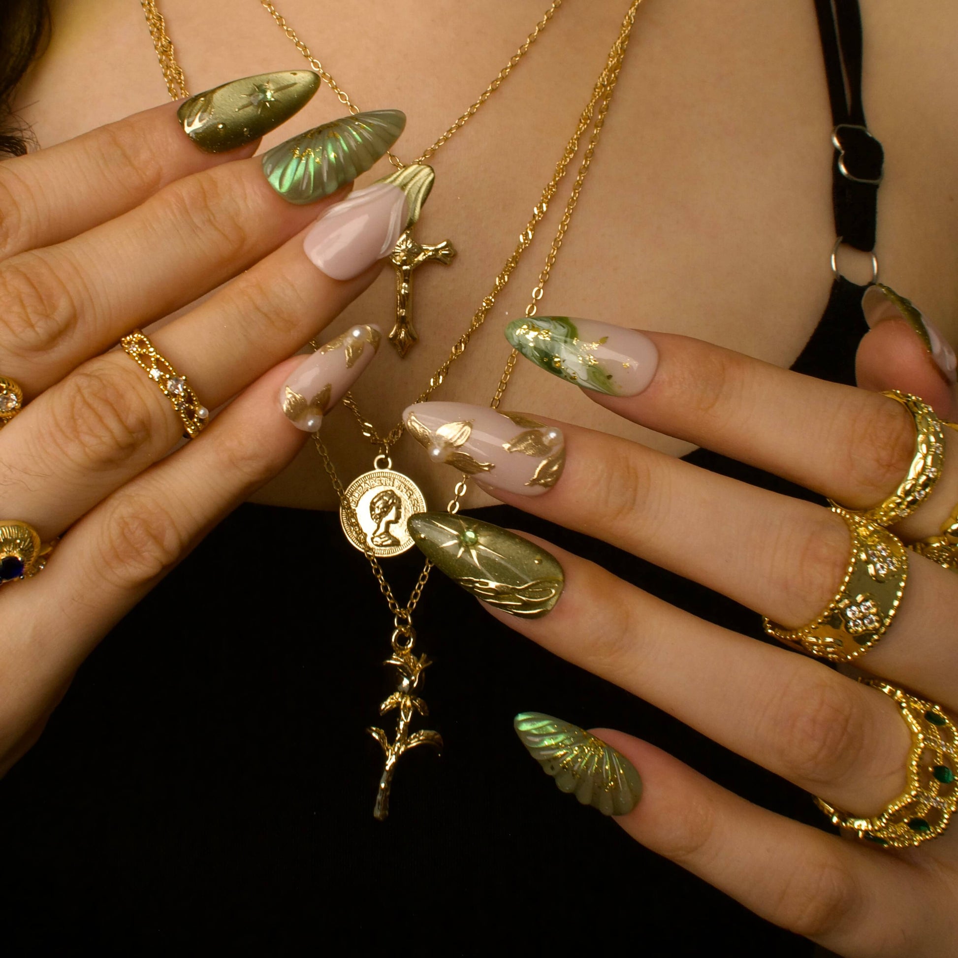 Immerse yourself in the vibrant charm of Lush Green press-on nails. Featuring a nude base with bold green accents, this design blends a French tip with captivating green cat-eye effects. The fingertips are adorned with stunning green marble patterns, while golden glitter adds a touch of sparkle. Enhanced with 3D mermaid details, Lush Green offers a unique, lush aesthetic perfect for any occasion. Elevate your nail art game with this exquisite combination of elegance and boldness.