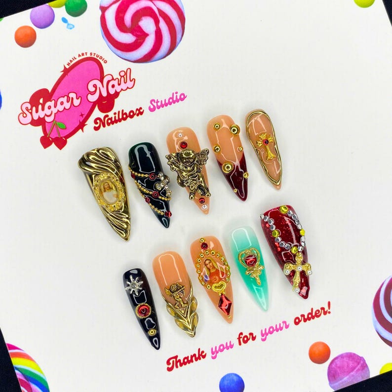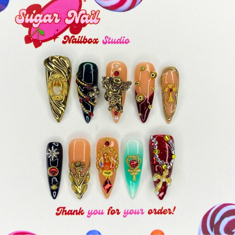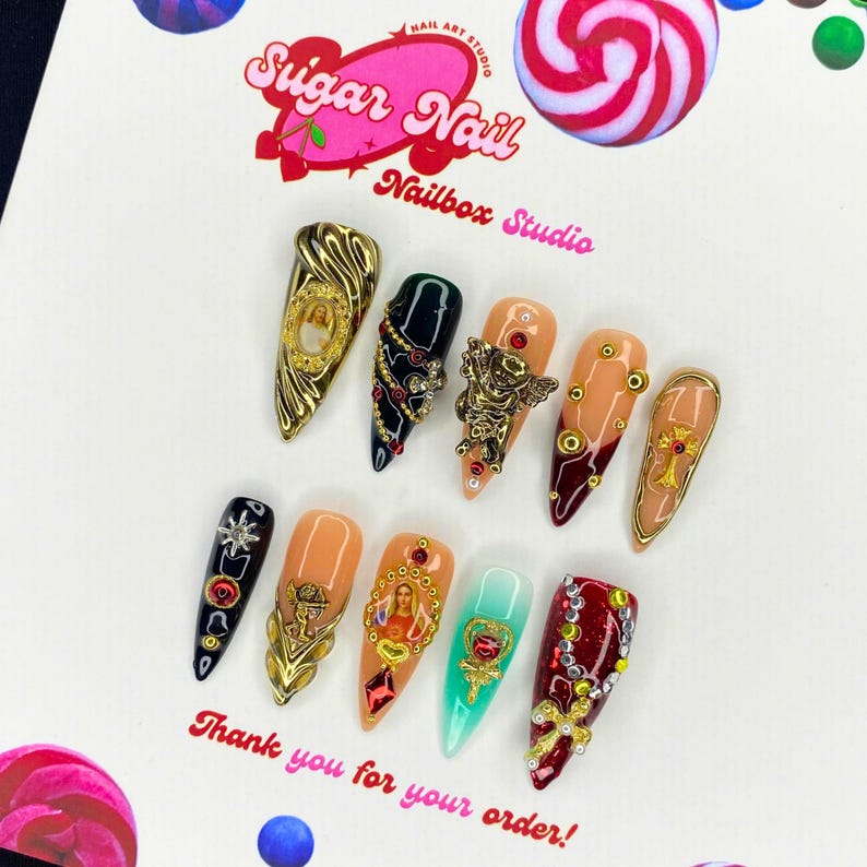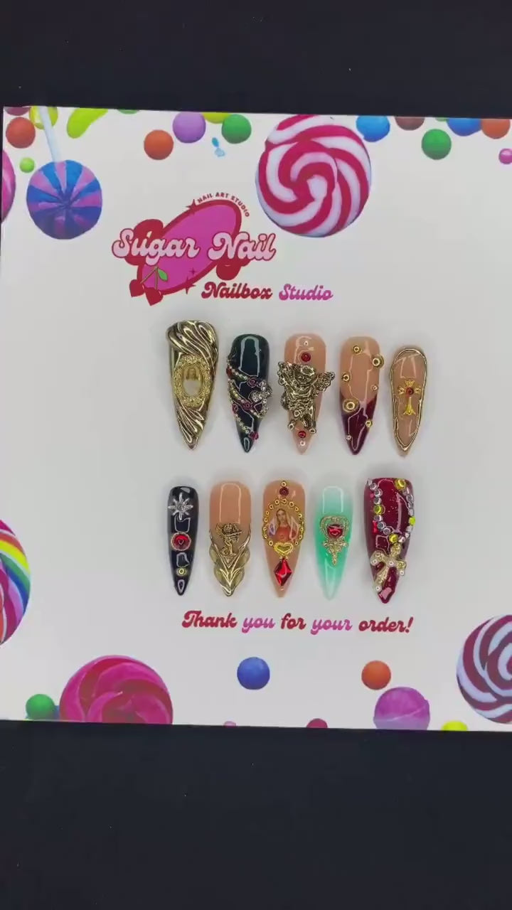 Each SugarNail set is crafted by hand using high-quality acrylic and gel, finished with a salon-grade glossy topcoat. Whether you're planning a holiday, prepping for a special event, or just want effortless beauty at home, our nails bring elegance and durability to your fingertips โ no appointment needed.