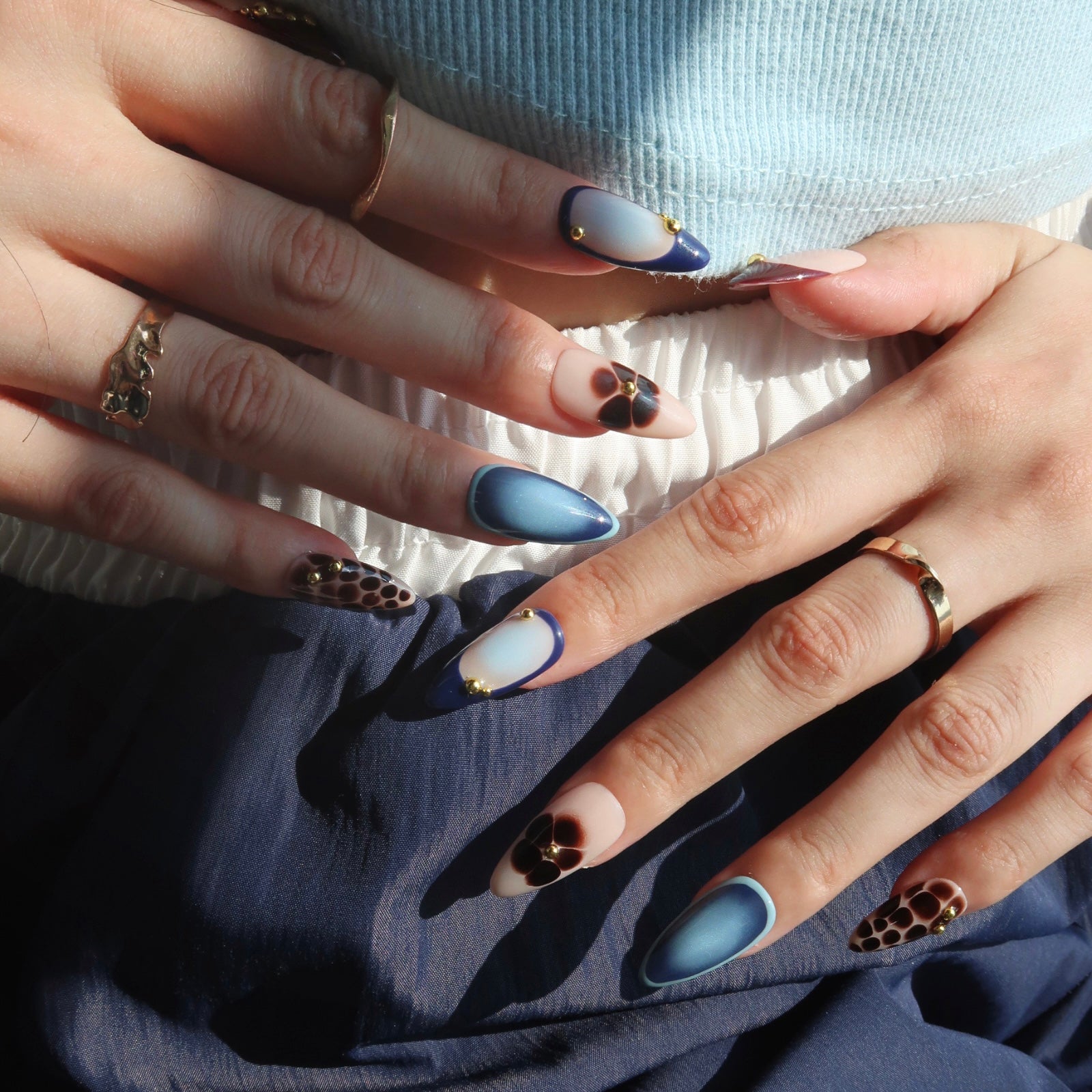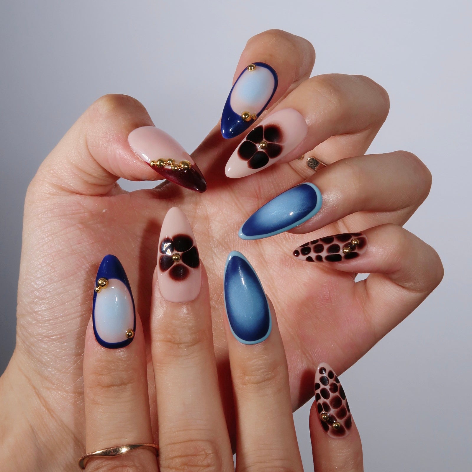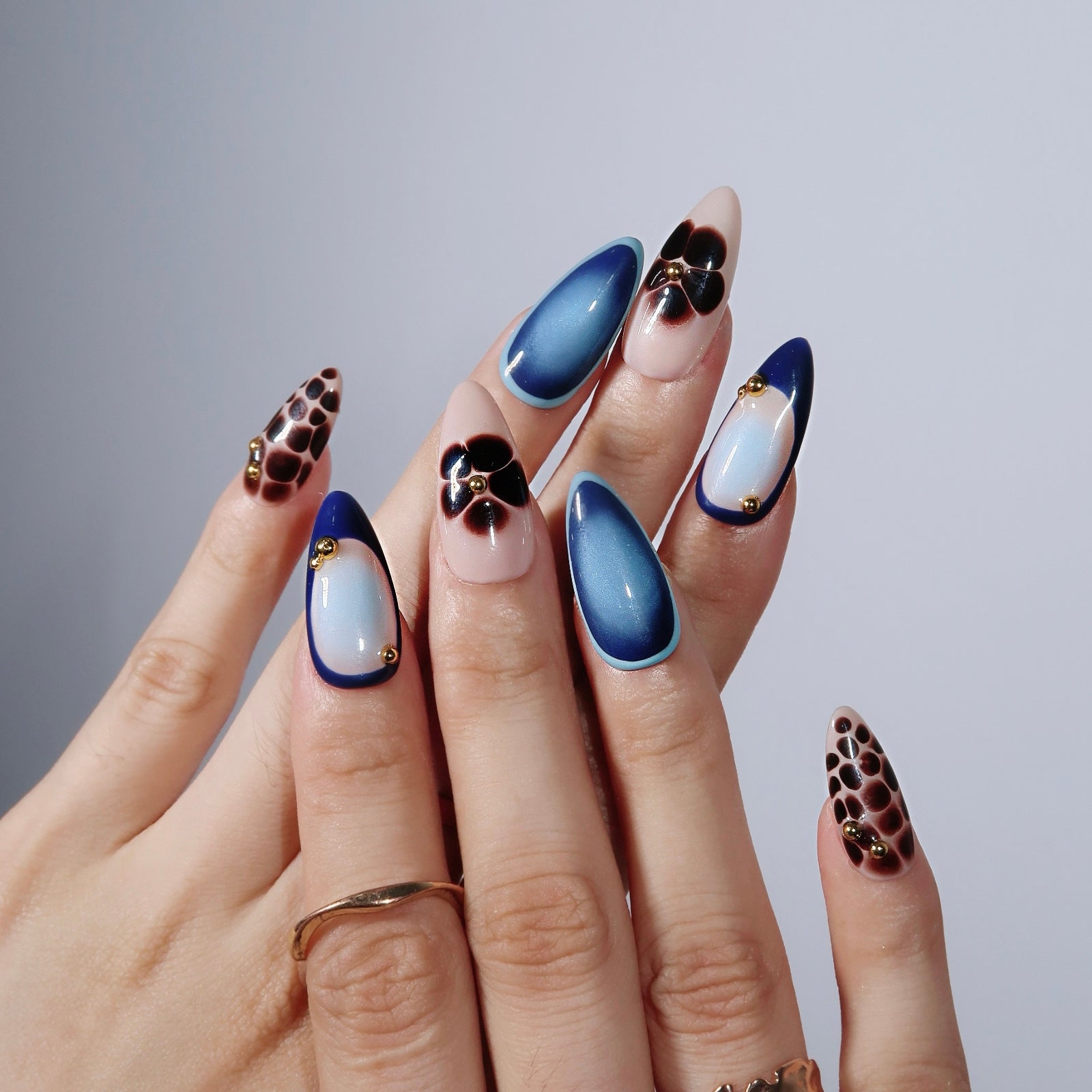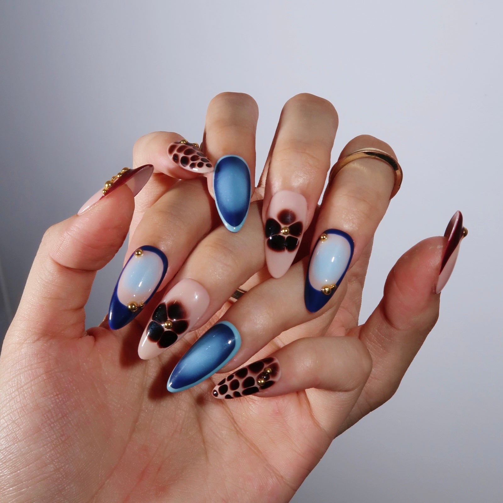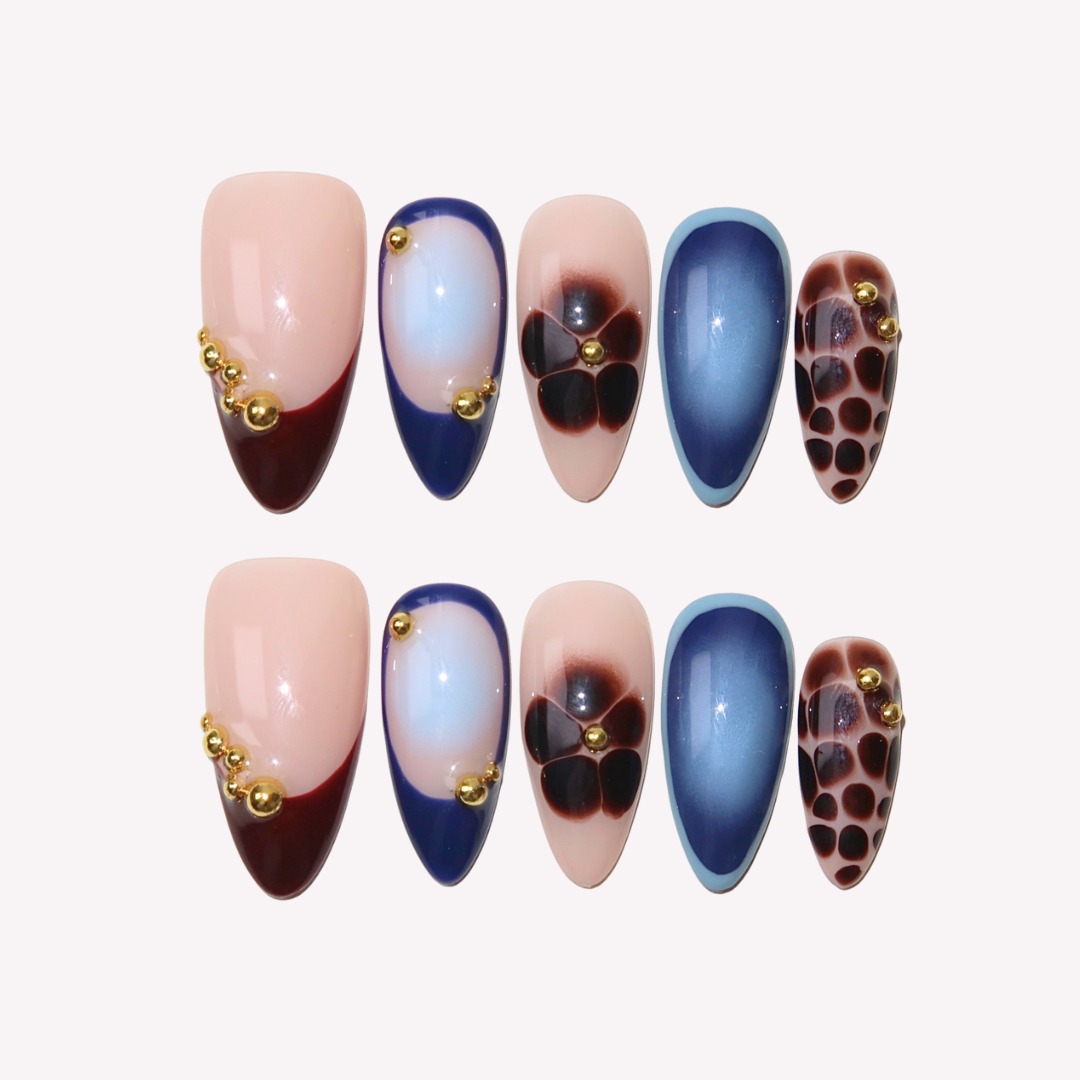 Embrace the allure of the night with Midnight Muse. This medium almond set combines deep maroon, rich navy blue, and playful floral designs, capturing the mystery and elegance of evening blooms. With a sleek cat-eye shimmer, tortoiseshell accents, and gold bead details, Midnight Muse brings a bold yet sophisticated edge to your style. Perfect for evening events or adding a touch of glamour to your everyday look, these press-on nails are your ultimate accessory for a chic, night-inspired vibe.