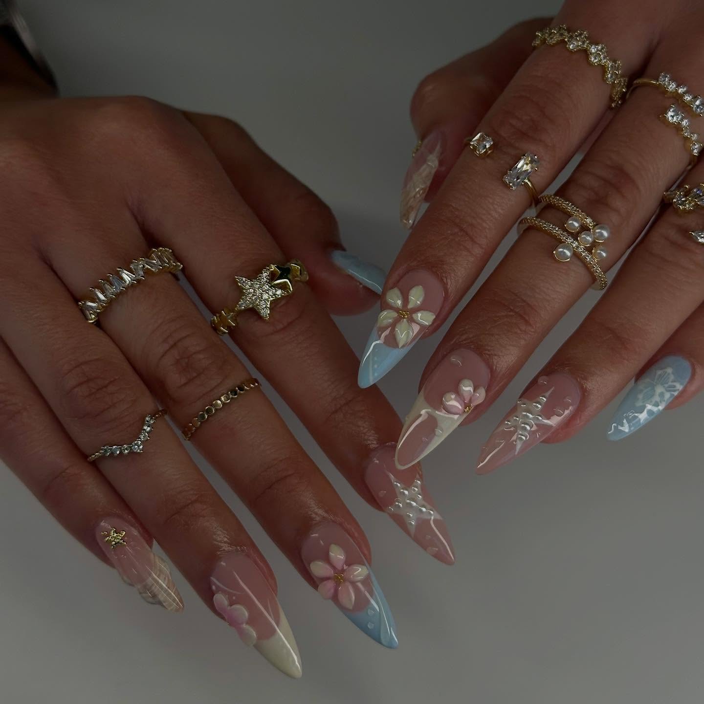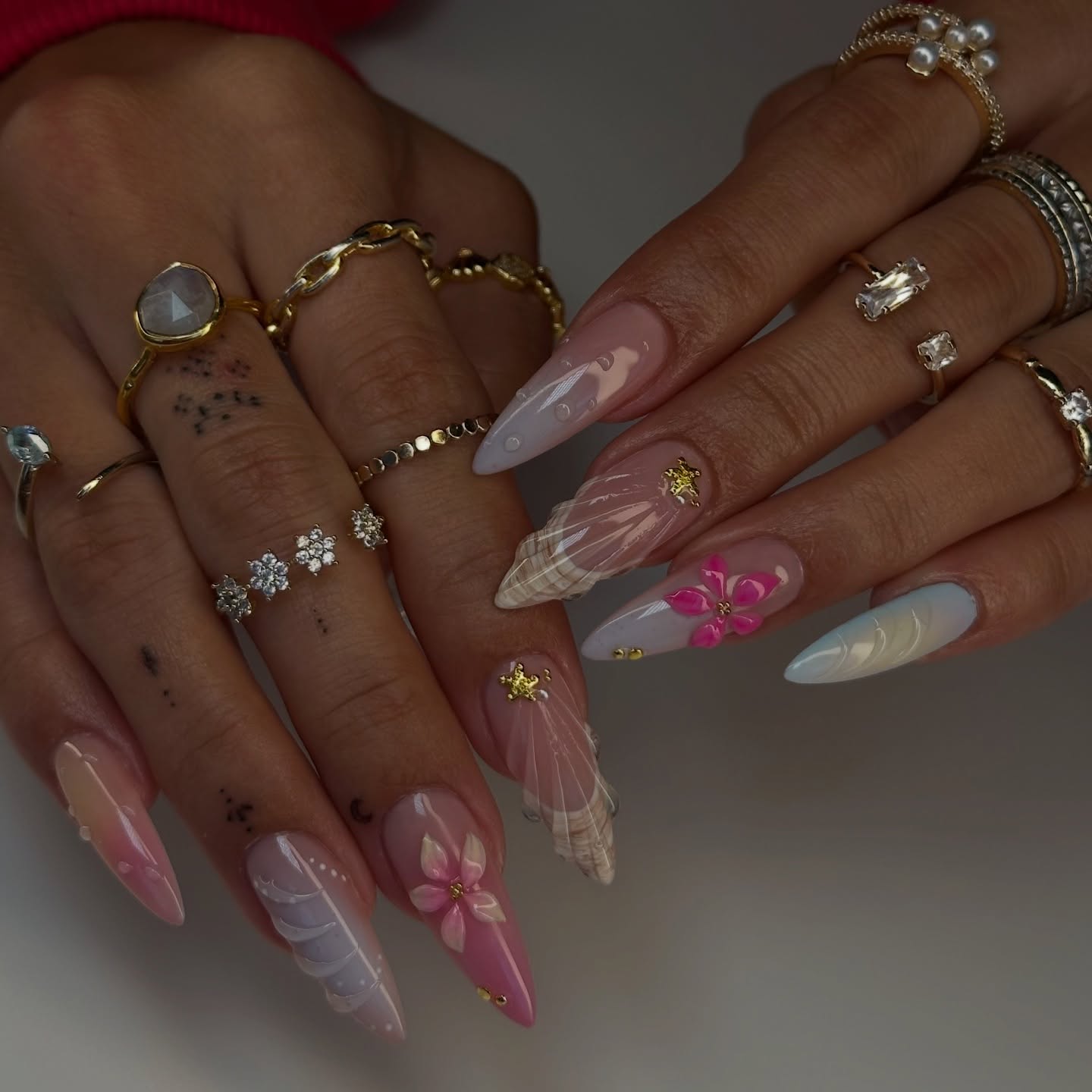 Each nail set is designed to feel like a mini vacation—fresh, colorful, and effortlessly eye-catching. Think blooming florals kissed by sunlight, pearly shell accents reflecting the sea, and glossy finishes that glow like water under the sun.
