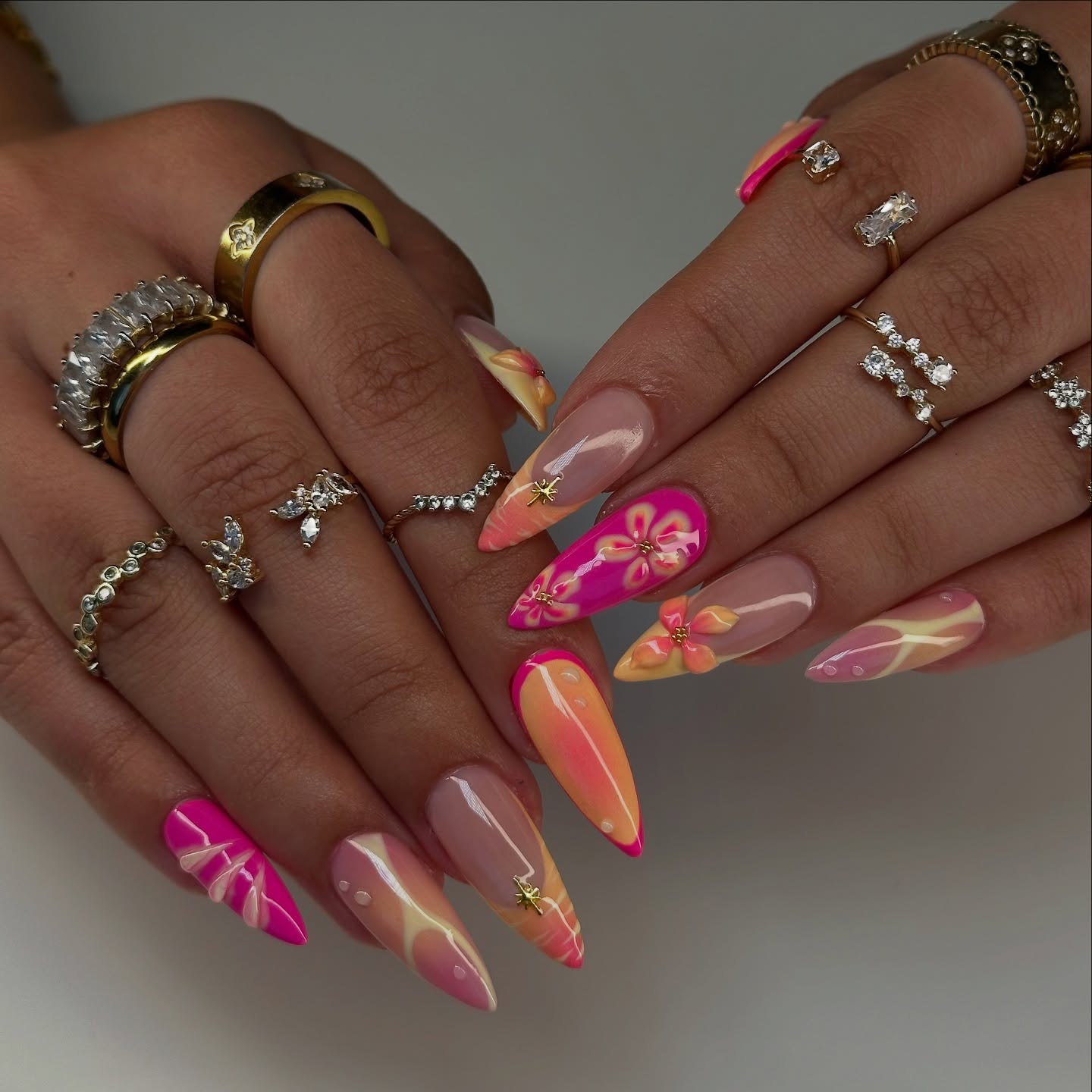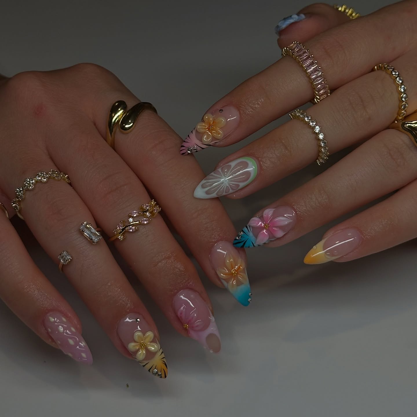 A lively collection of handmade press-on nails inspired by tropical flowers and ocean treasures. Featuring bright summer hues, 3D floral details, shell textures, and glossy finishes, these nails are perfect for beach days, vacations, and bold everyday looks.