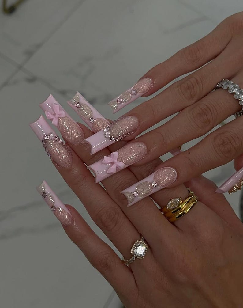 Princess Crystal Bow Press On Nails: Light Pink Cat Eye, Glitter French Tip | Valentines Pink Bow Press On Nails | Pink French Nail Art