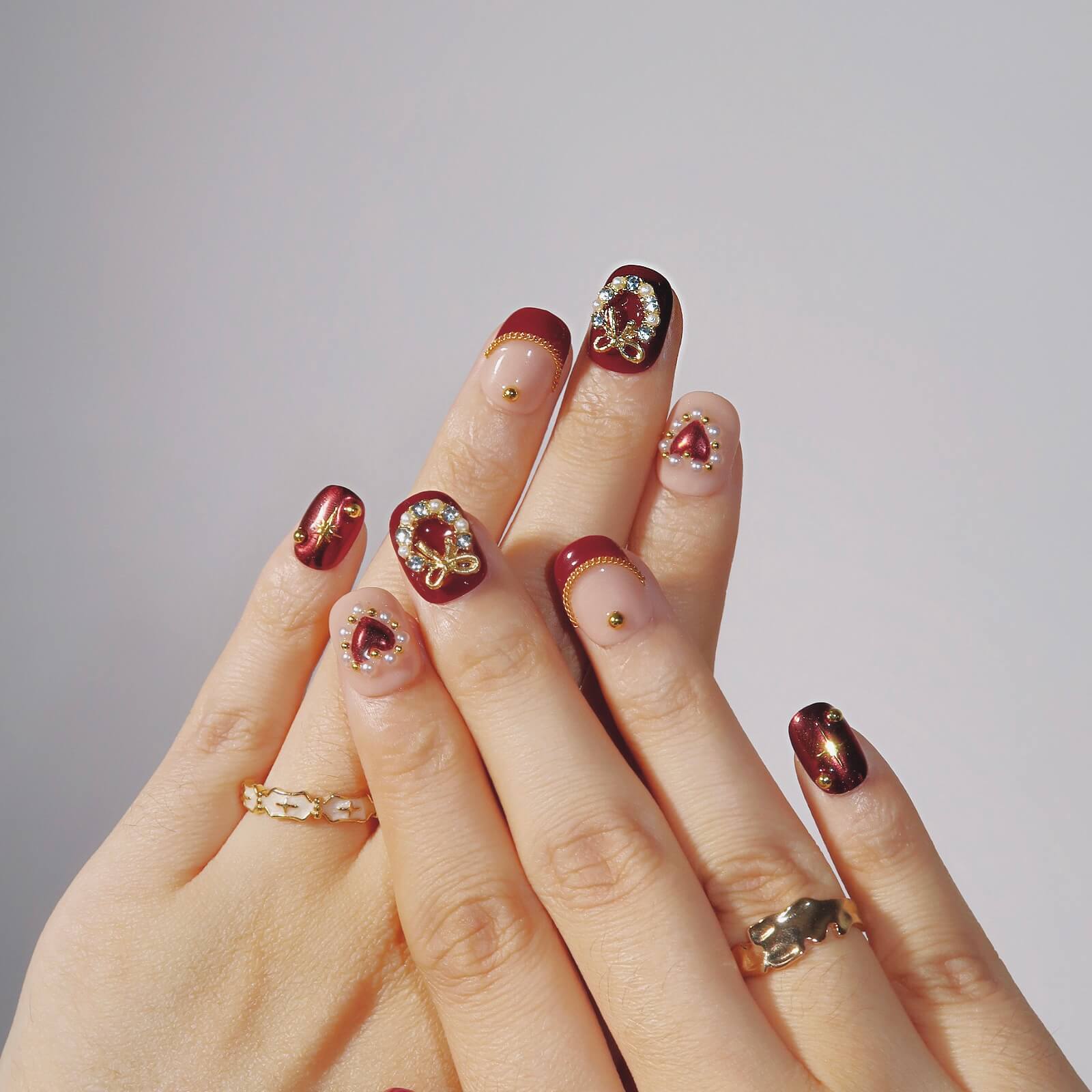 Embrace the spirit of love and celebration with Rosy Bliss. This stunning set features a nude base with vibrant red French tips, adorned with delicate rose flowers, hearts, and floral wreaths for a romantic touch. Golden beads add a touch of luxury, while the festive design brings a joyful, holiday-inspired vibe. Perfect for adding a sweet and elegant touch to your nails, Rosy Bliss is ideal for any occasion that calls for a little extra charm and celebration.