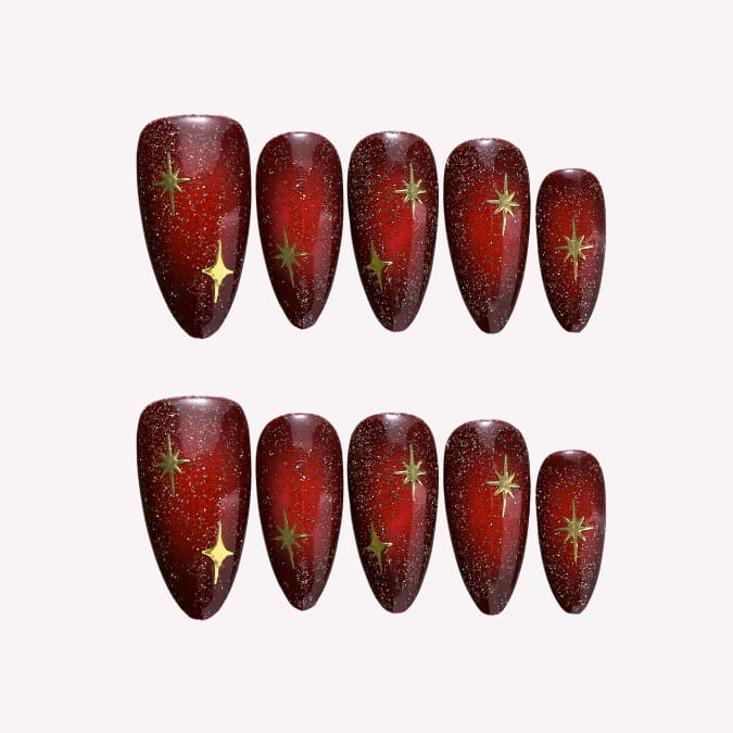 Jewel-Toned Base: A rich, high-gloss ruby red nails base that offers a luxurious depth and shine, perfect for the holiday season.