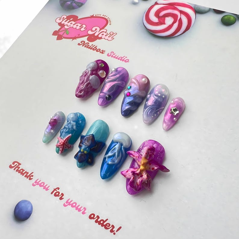 Sea Orchid Glow โ Ocean-inspired press on nails with glowing orchid details and soft blue hues. Long-lasting, elegant design perfect for summer and beach lovers.