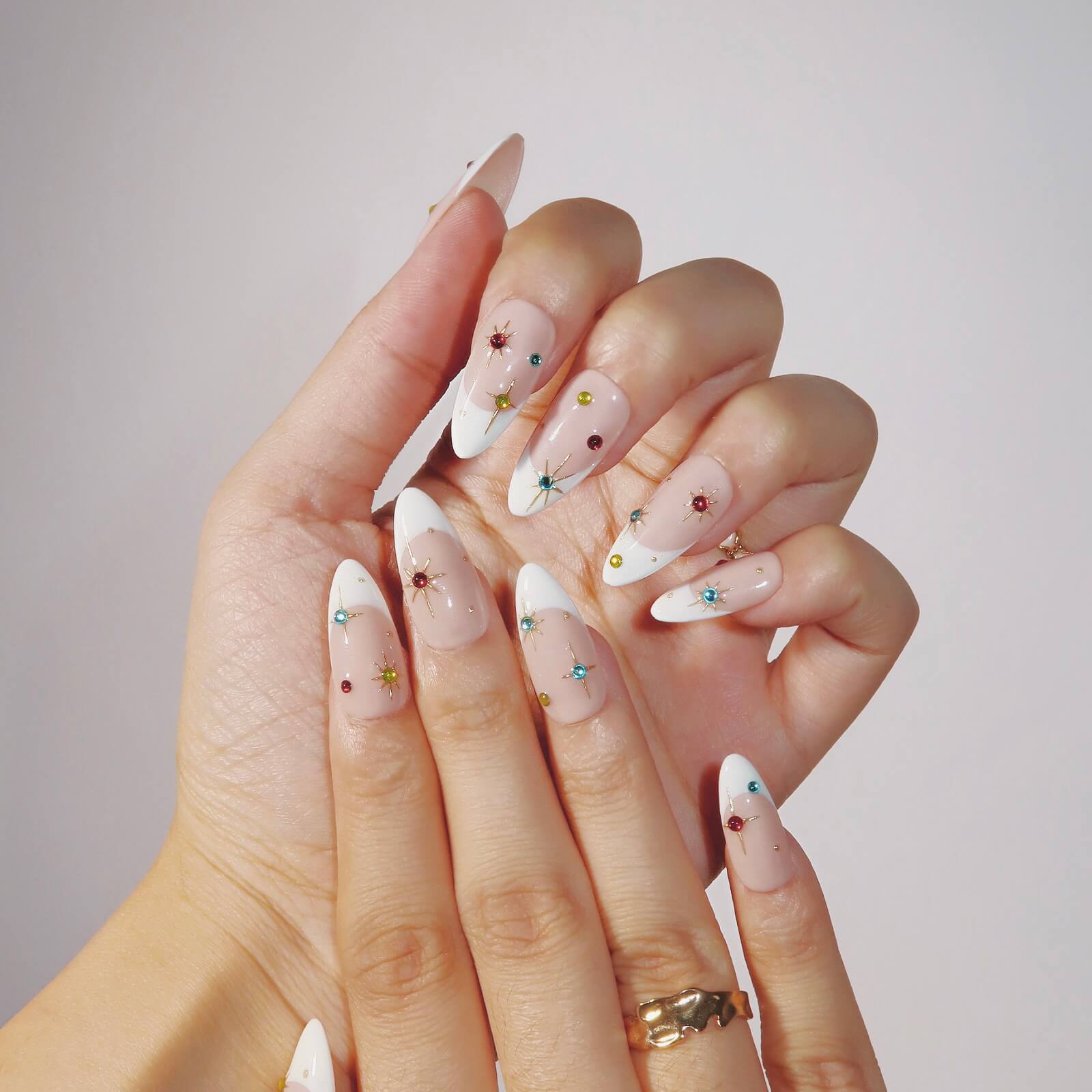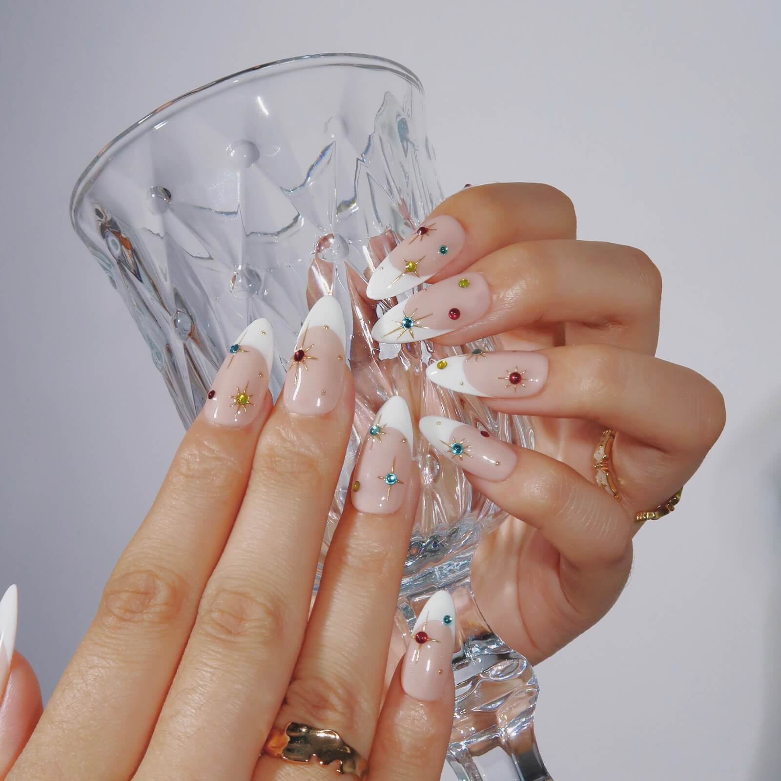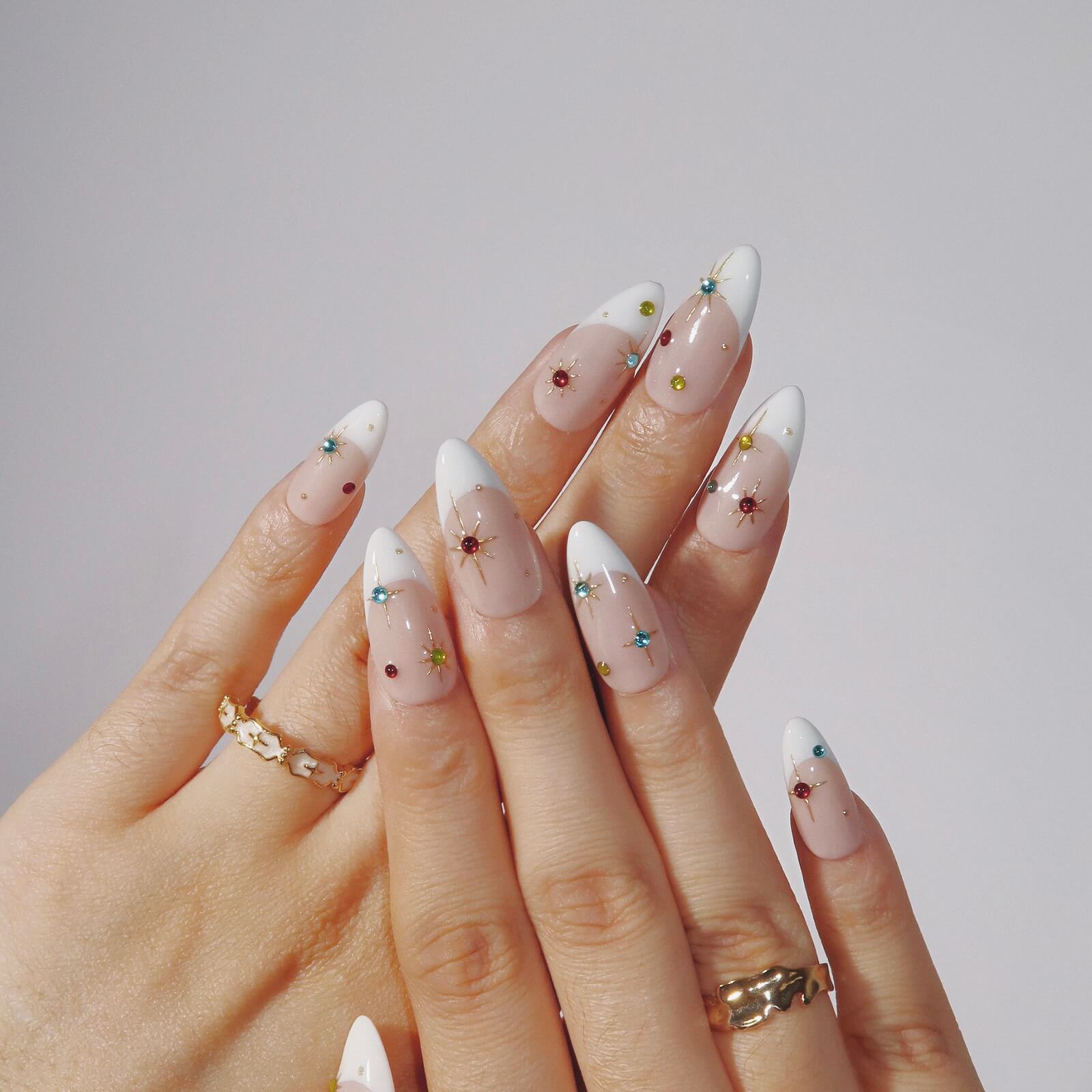Experience the magic of the season with Silent Night. This stunning set features a nude base with a classic white French tip design, beautifully accented with colorful rhinestones for a vibrant, festive touch. Delicate star patterns add a whimsical charm, creating a look that's both elegant and playful. Silent Night is the perfect choice for adding a sparkling, joyful touch to your nails, whether for the holidays or any special occasion.