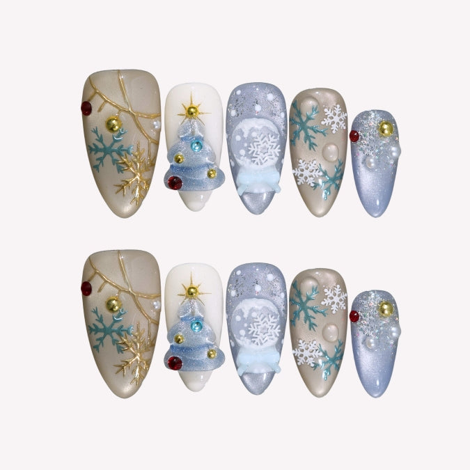 Let your hands sing the silent, beautiful song of winter with the Snowy Melody Luxury Press-On Nails. This exquisite set harmonizes soft, shimmering colors with whimsical details, offering a unique and artistic choice among winter nails and holiday press-ons. It's the perfect way to wear your passion for music and the cozy beauty of the season.