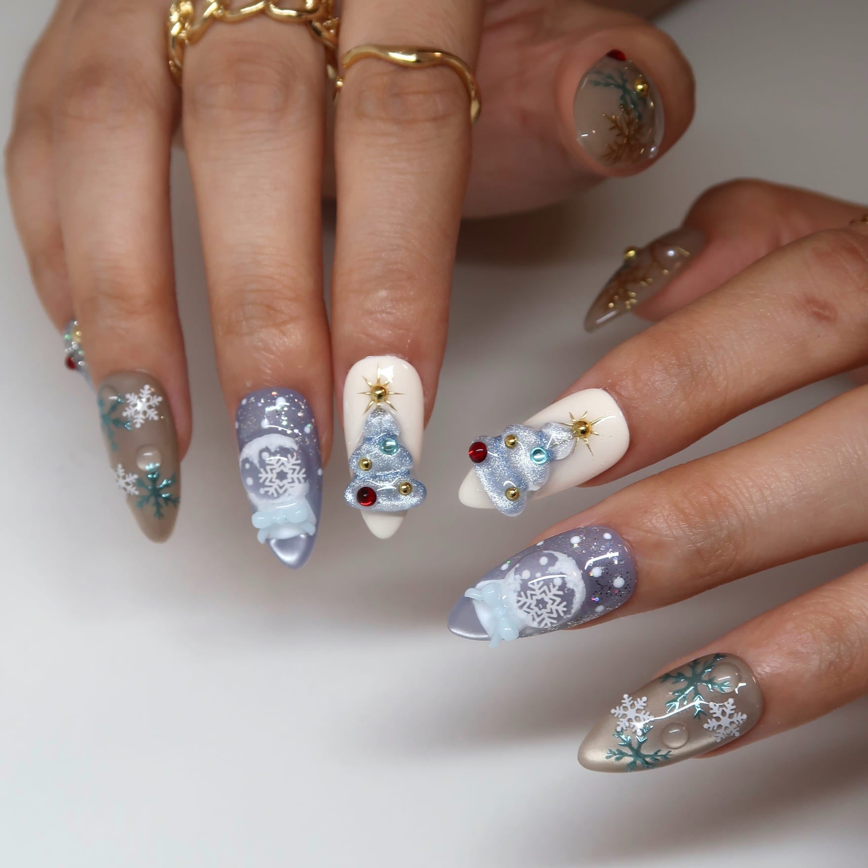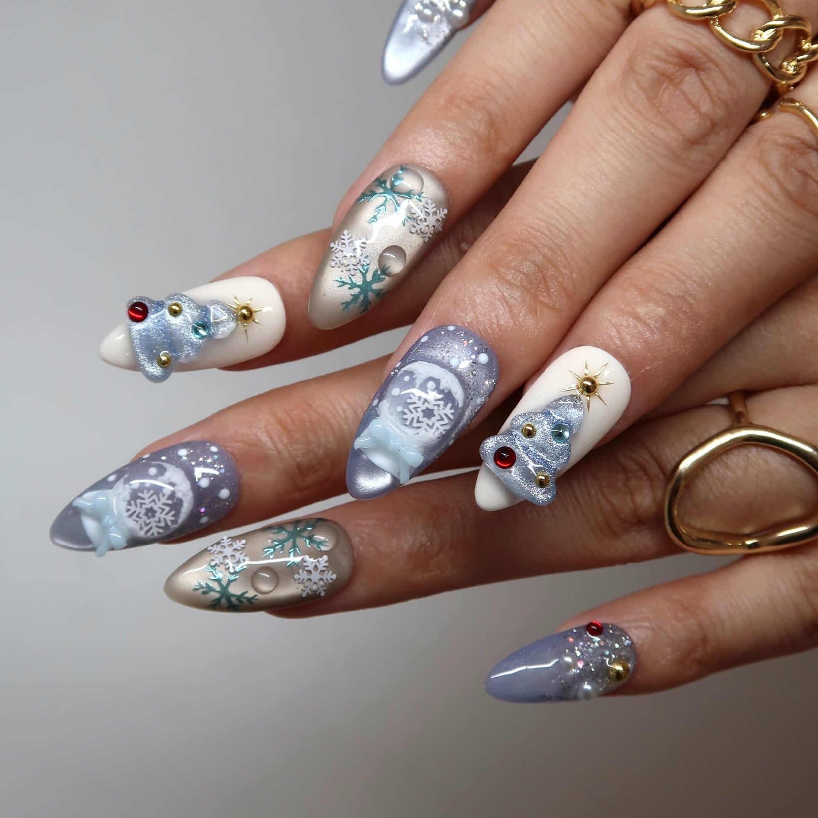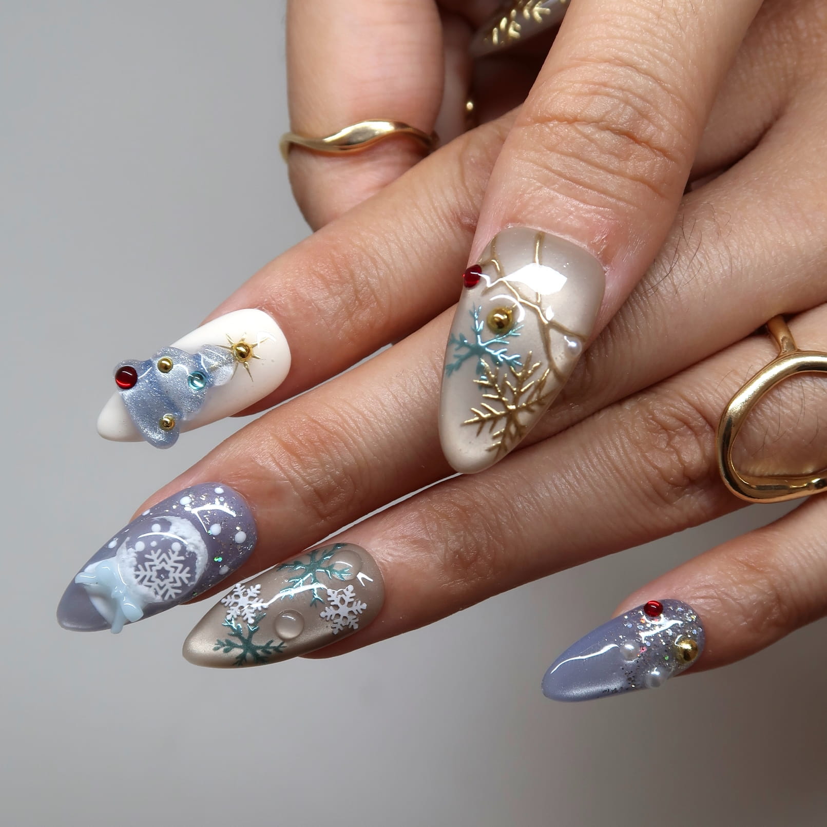 Whimsical Snowflakes: Delicate silver or glitter snowflake nails on accent fingers, completing the frosty theme.