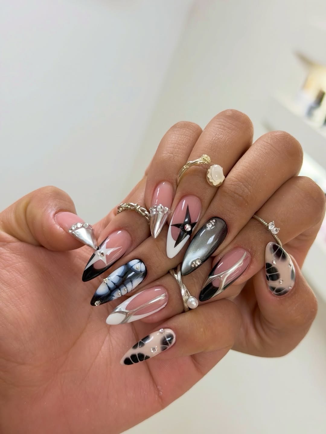 - Trendy color palette: silver, holographic, pink chrome, and cosmic tones