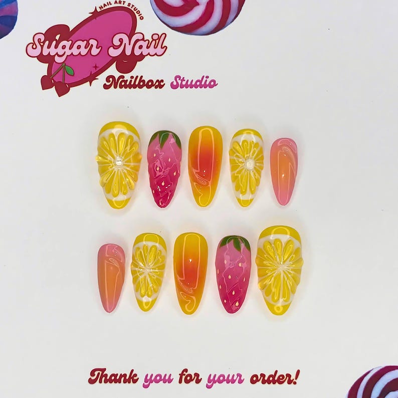 Celebrate sunshine and sweetness with Summer Fruit — a handcrafted press-on nail set inspired by juicy oranges, fresh strawberries, and tropical pineapples. This vibrant design blends bright oranges, warm yellows, and soft red tones with adorable fruit accents, creating a fun, summery look perfect for vacations, beach days, and everyday cheerful style.