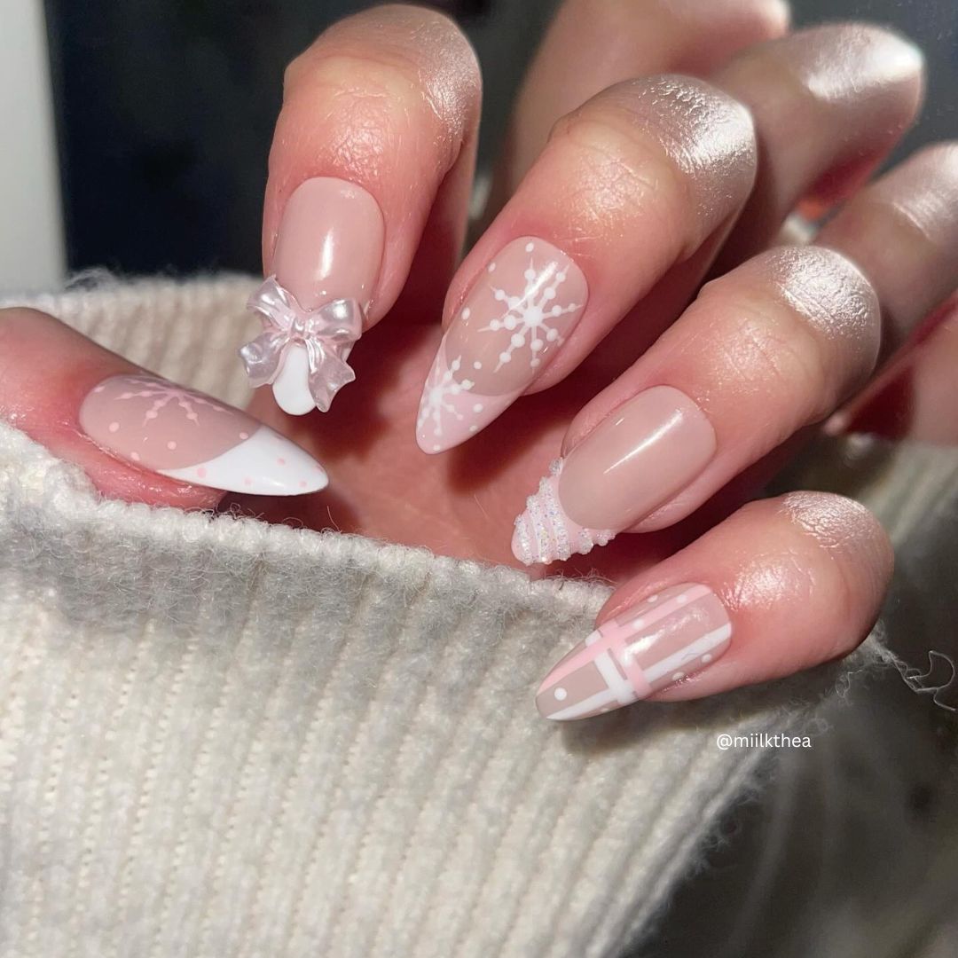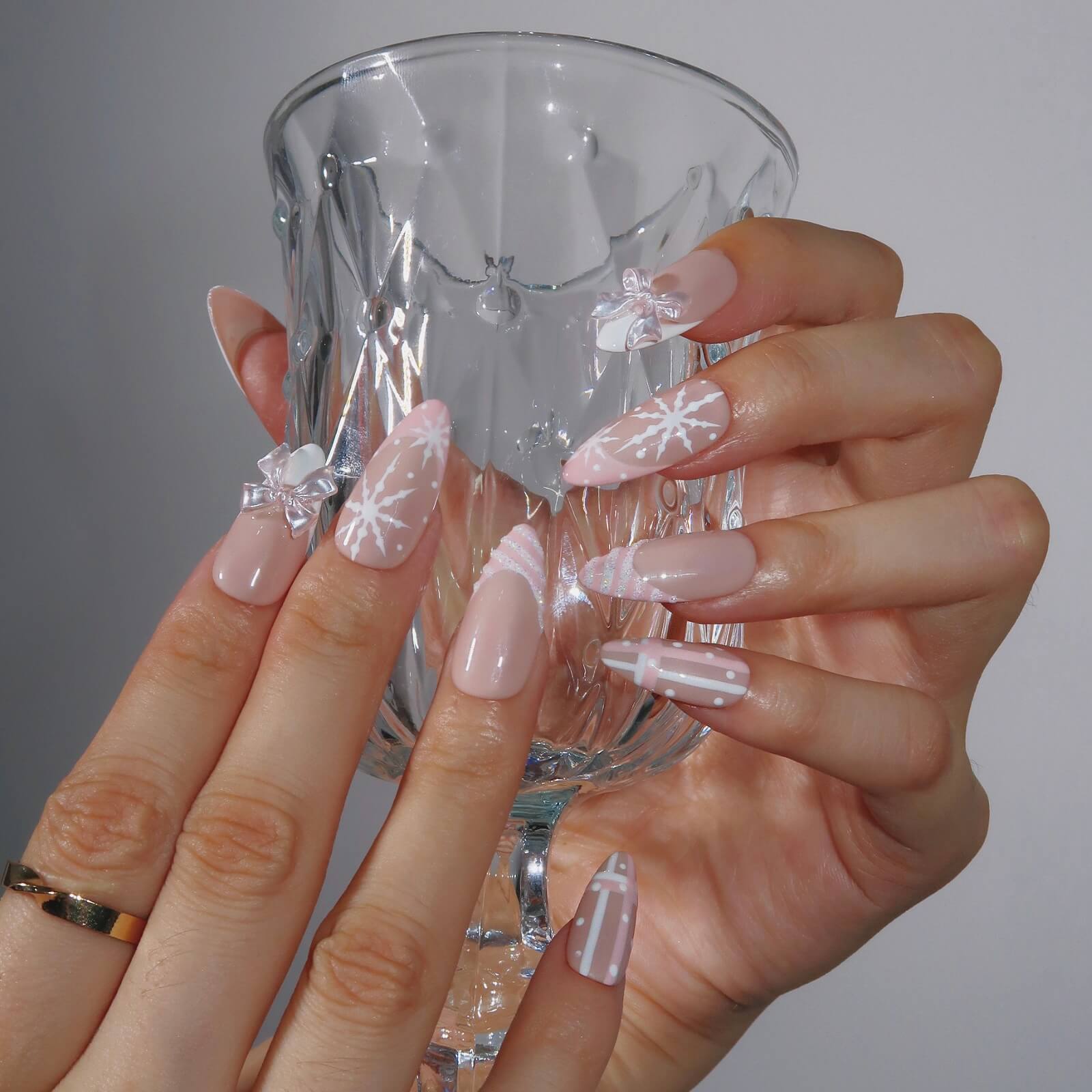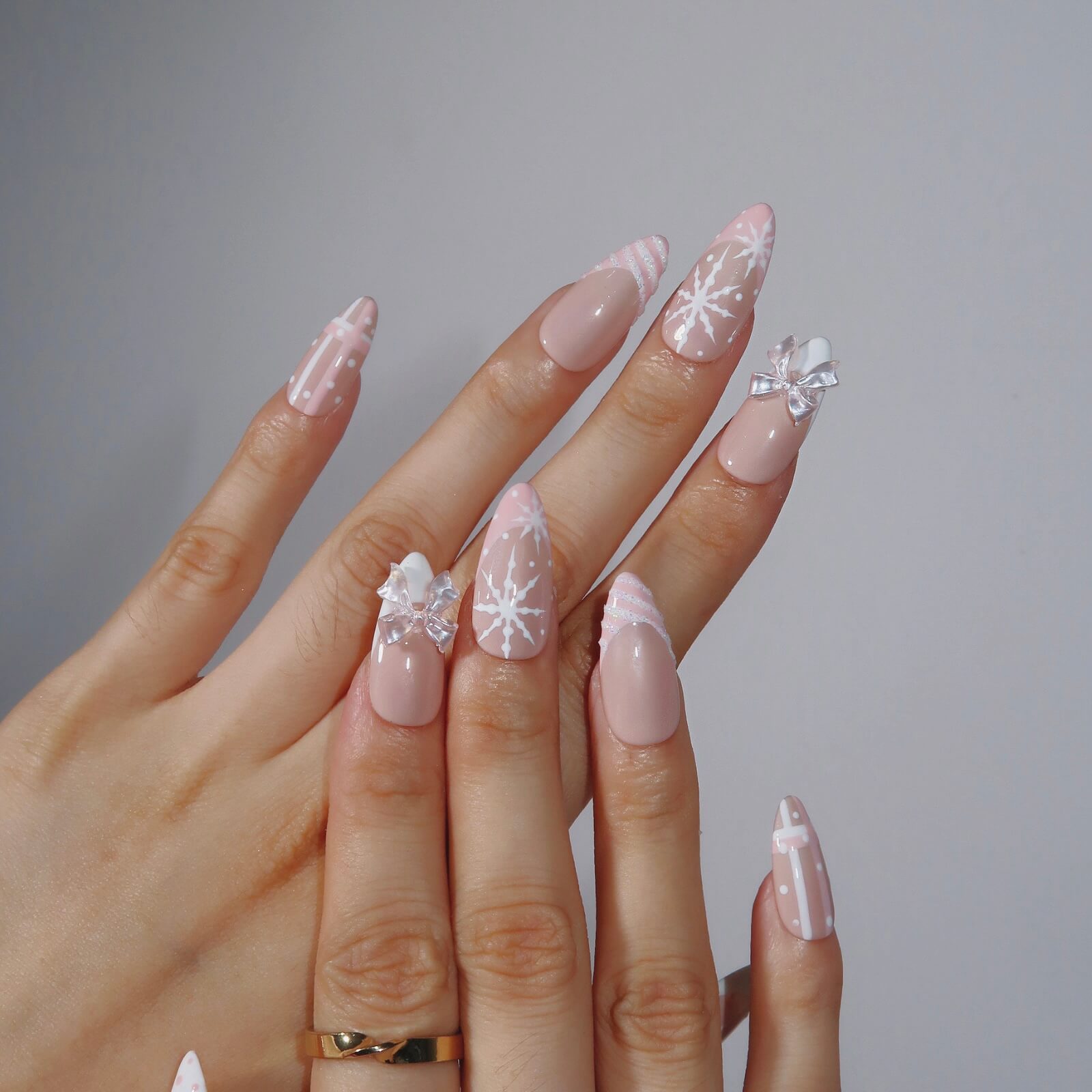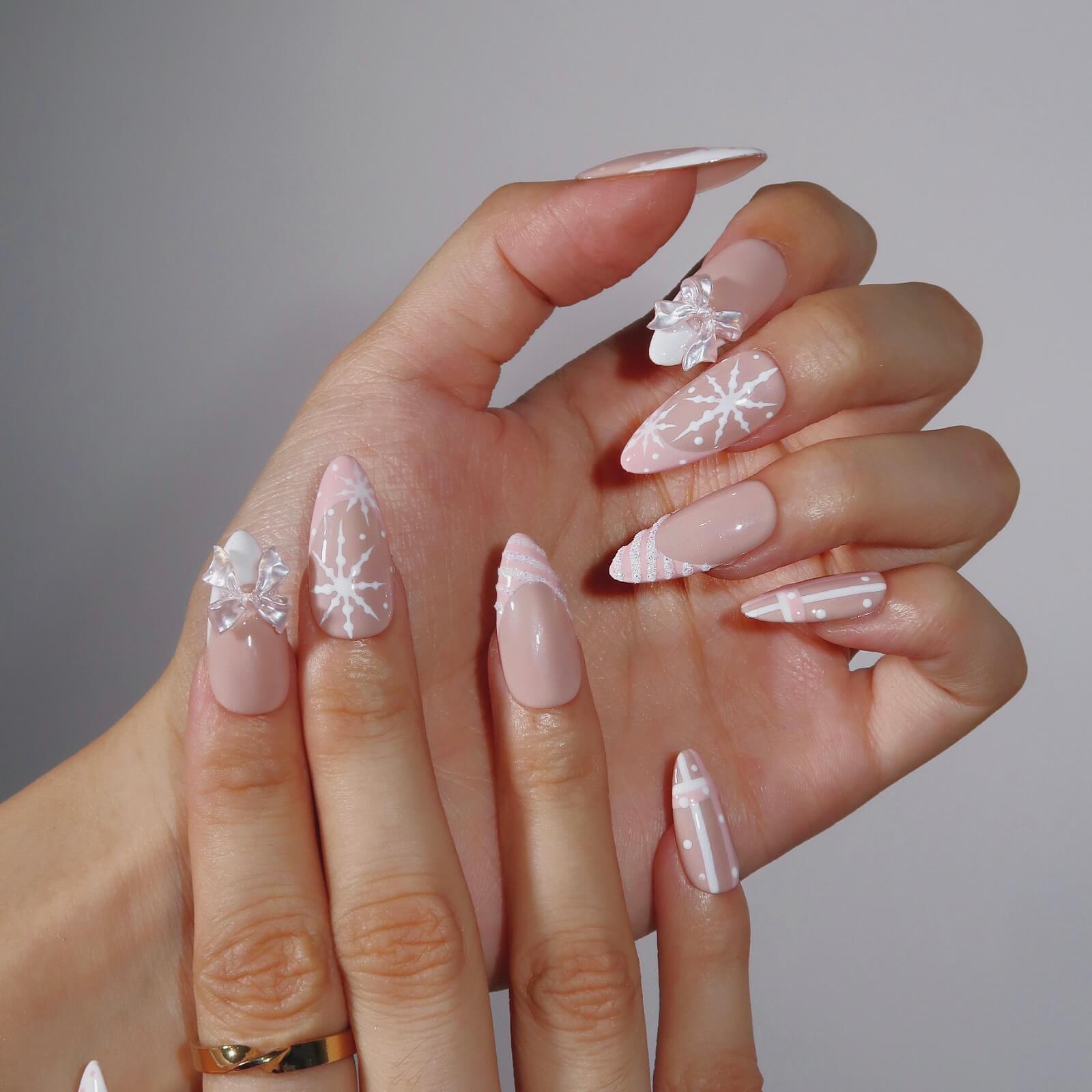Embrace the elegance of the season with Winter's Gift, a design inspired by the magic of winter. This set features a classic French design on a nude base, beautifully accented with delicate snowflake patterns and charming polka dots. A dainty bow embellishment on the index finger adds a touch of festive sophistication, making it perfect for the holiday season. Let your nails shine with the graceful charm of Winter's Gift!