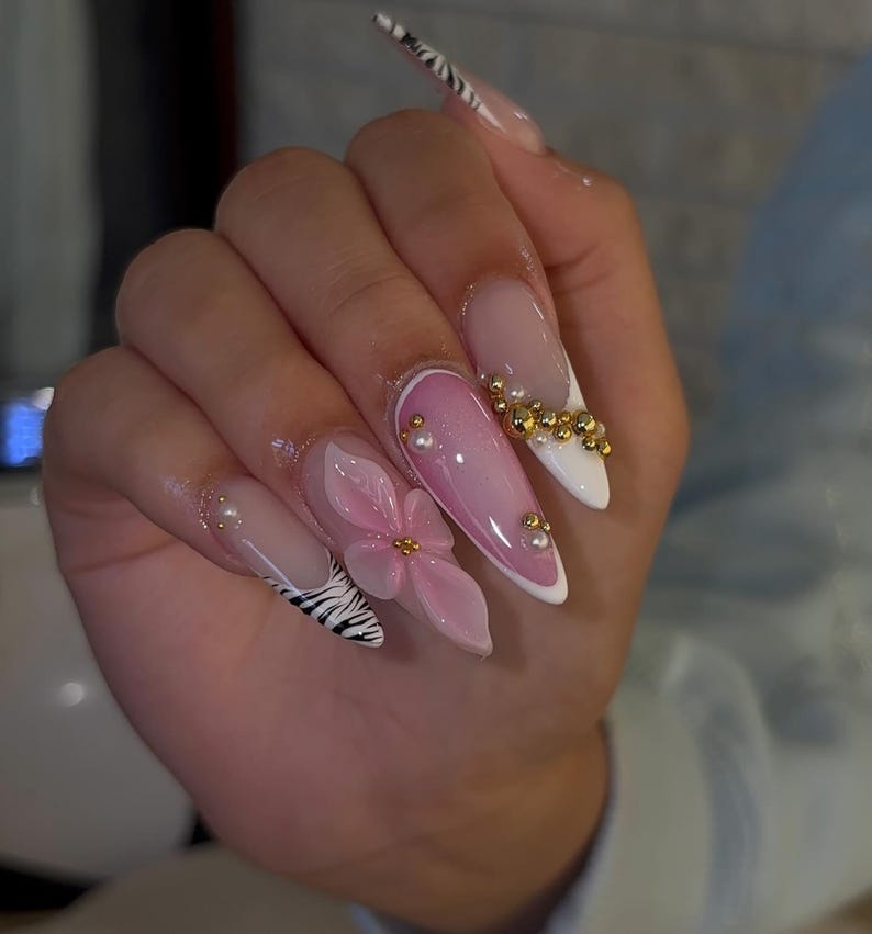 Zebra Glam Flower Press On Nails | Pink 3D Floral Rhinestone Nails | Long Stiletto Zebra Print Nail | Elegant Glam Safari Aesthetic Nail